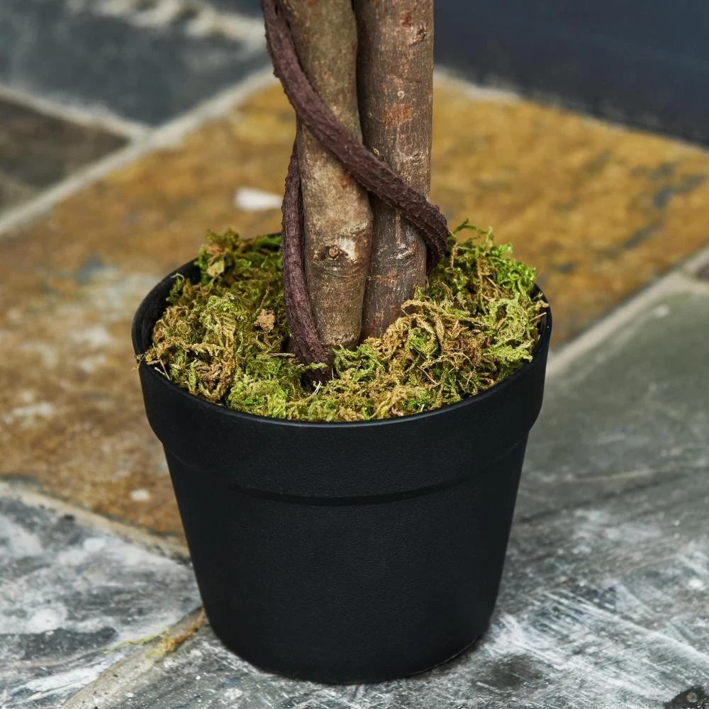 – Couleurs principales : vert et marron (ficus), noir (pot inclus)