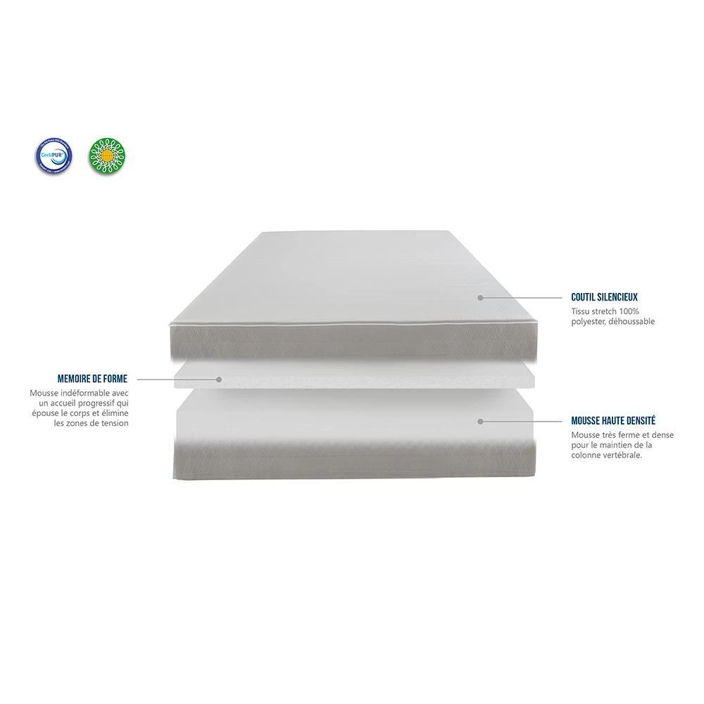 - 18 cm de mousse Haute Densité de 28 kg/m³ + 3 cm de mousse à mémoire de forme de 50 kg/m³