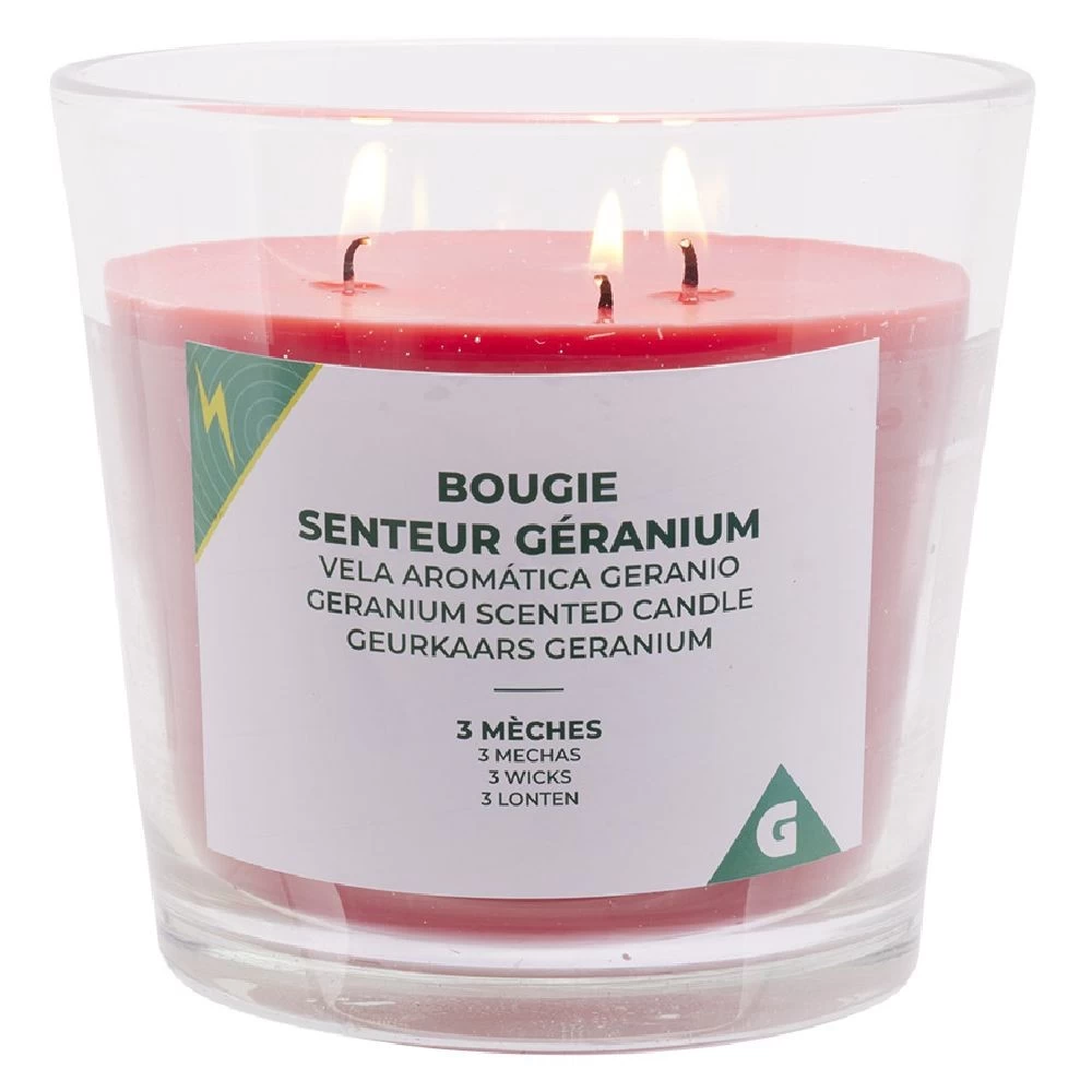 Bougie rouge senteur Géranium composée de 3 mèches, le tout dans son pot de verre.
