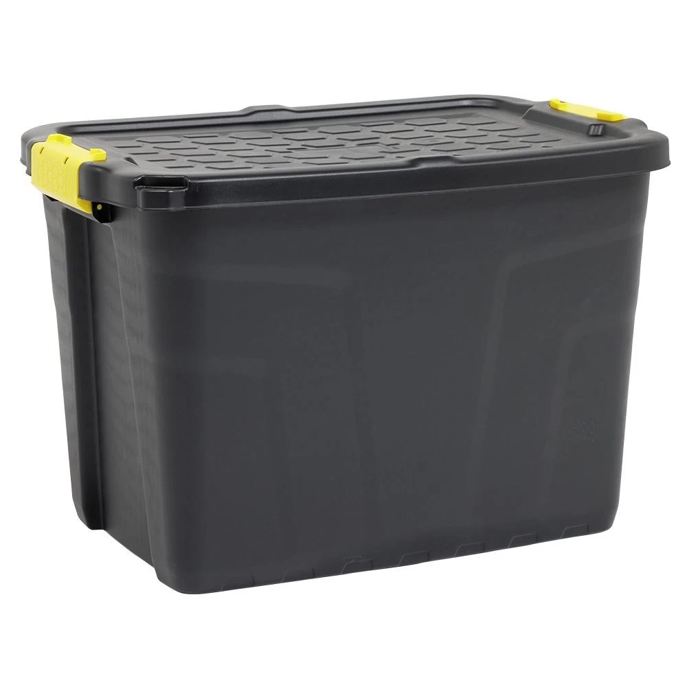 Box de rangement en plastique noir, idéal pour le rangement du garage.