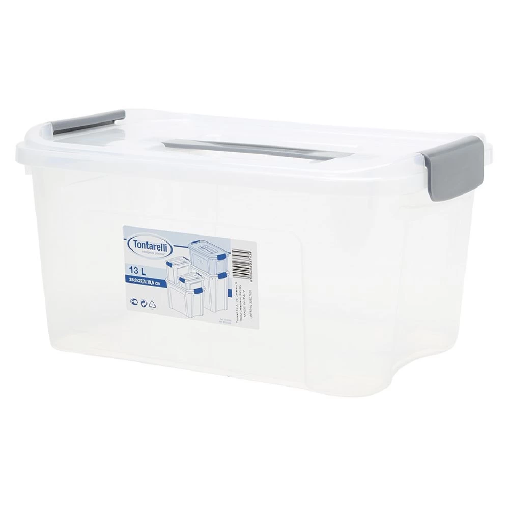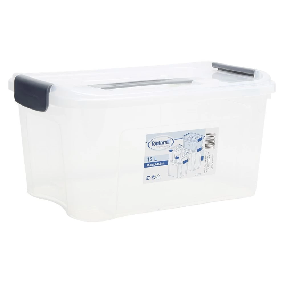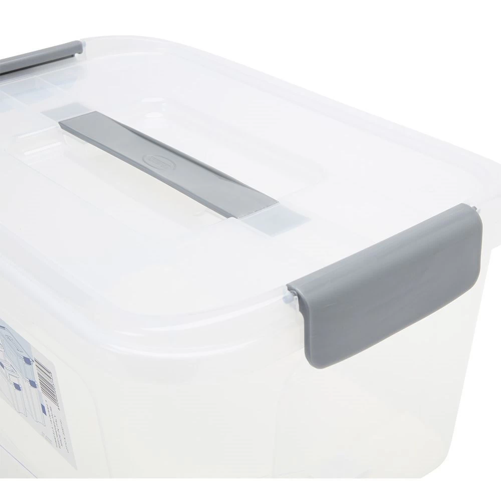 Box de rangement en plastique transparent avec clips de fermeture et poignées de préhension vers le bas pour un accès facilité.