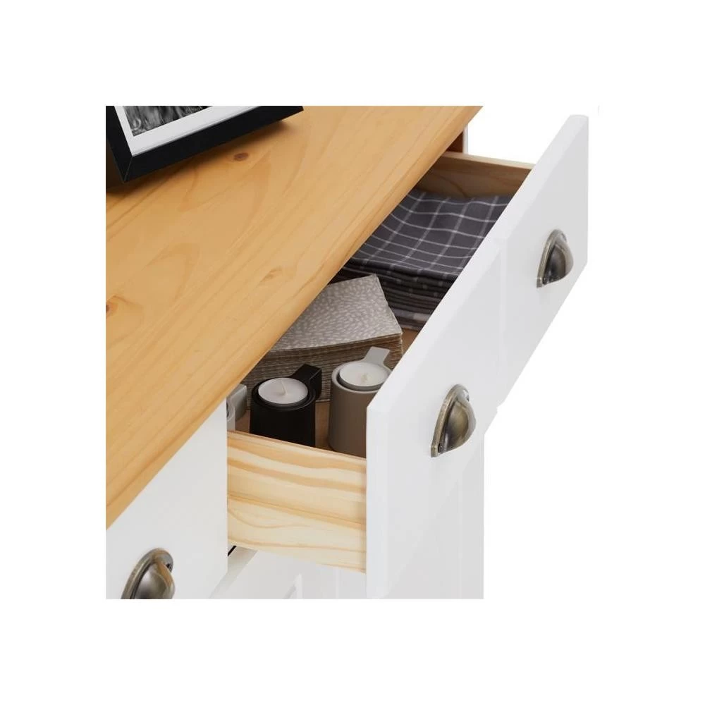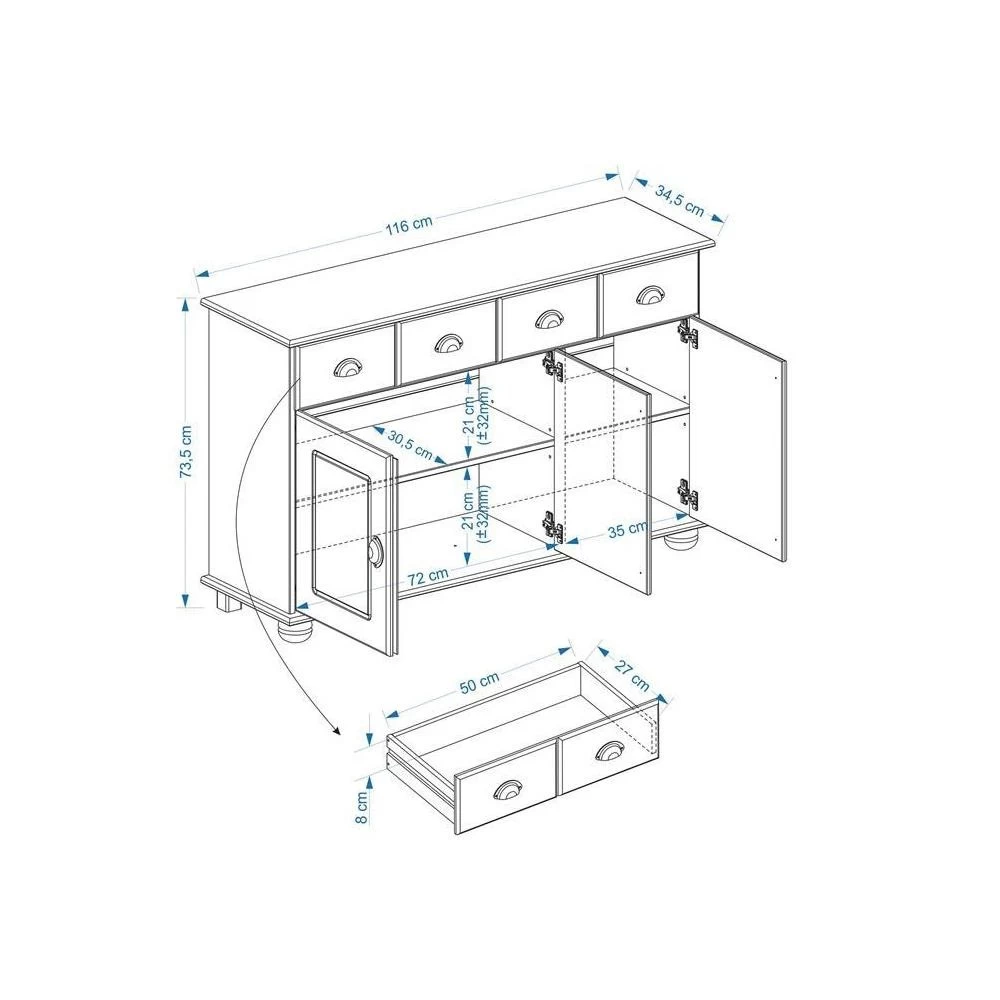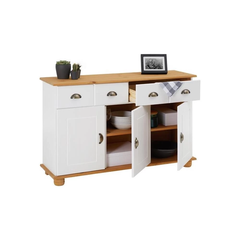 – Le buffet est fabriqué en pin massif recouvert d’une lasure blanche et brune.