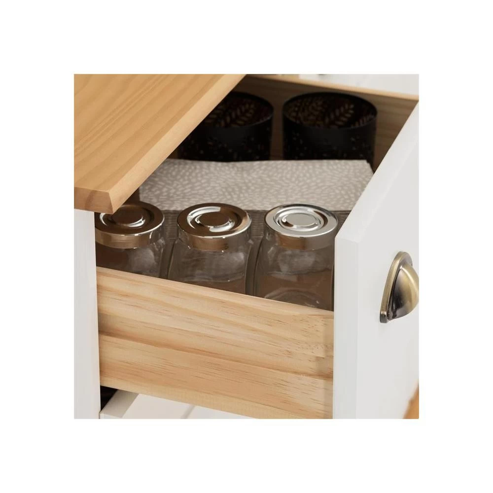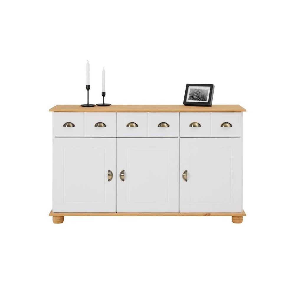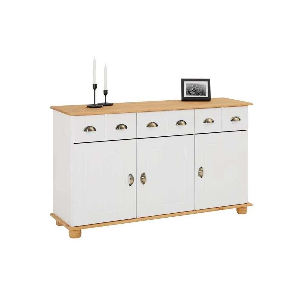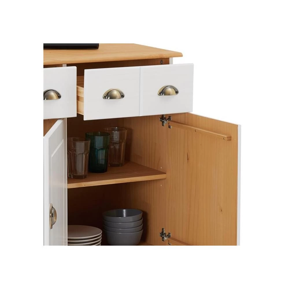 – Le buffet est fabriqué en pin massif recouvert d’une lasure blanche et brune.
