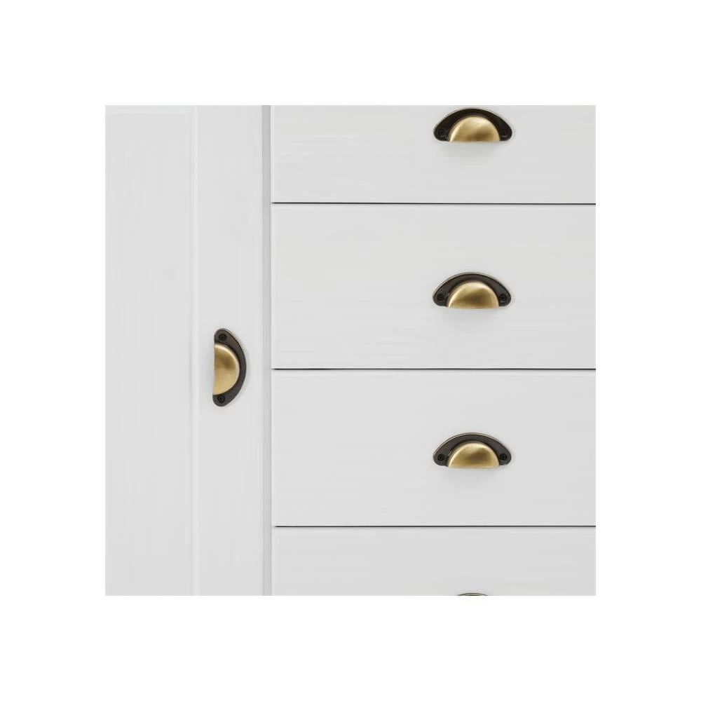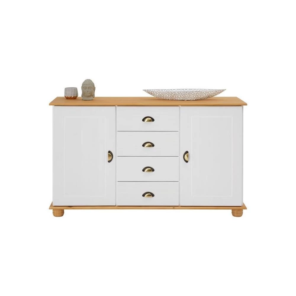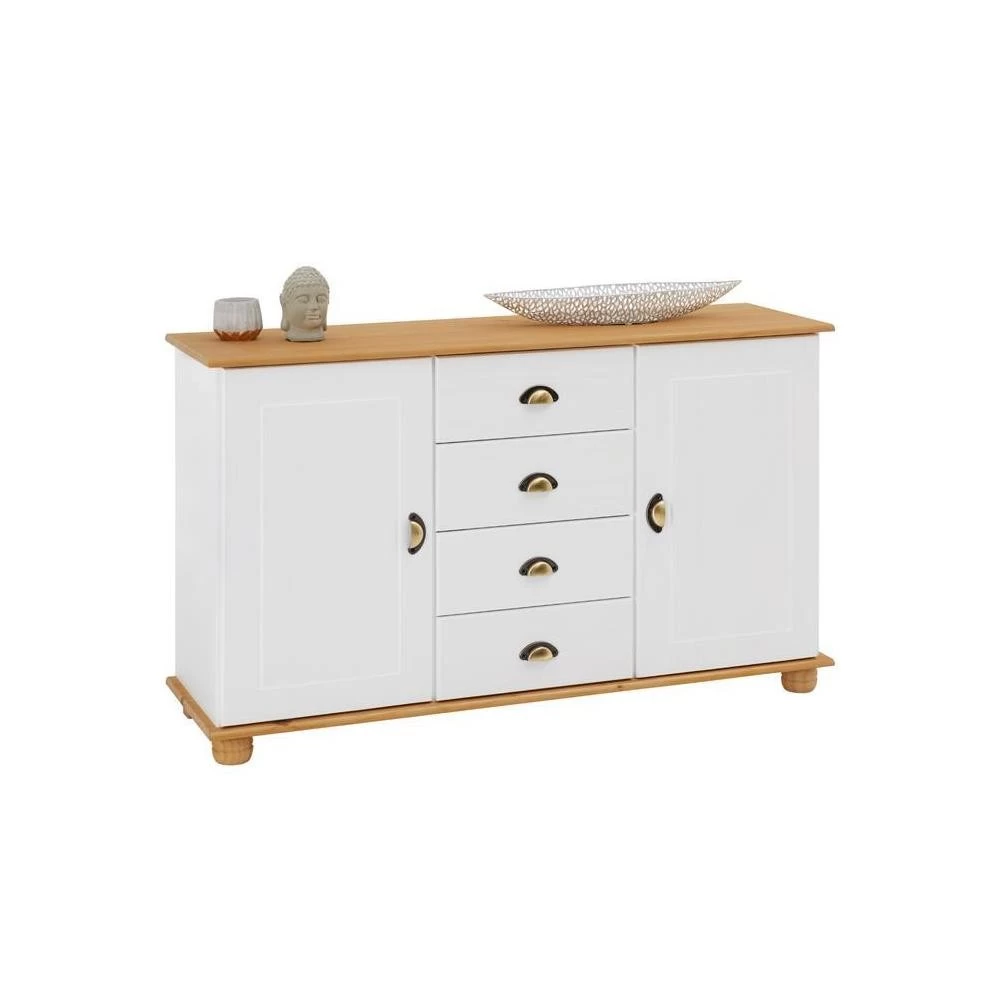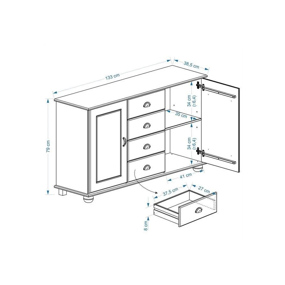 – Le buffet est fabriqué en pin massif recouvert d’une lasure blanche et brune.