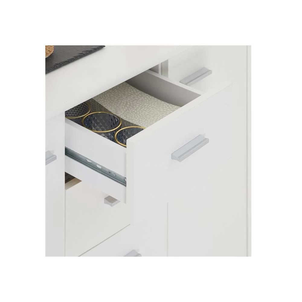 – Le buffet est fabriqué à partir de panneaux de particules de bois recouvert d’un mélaminé de coloris blanc mat.