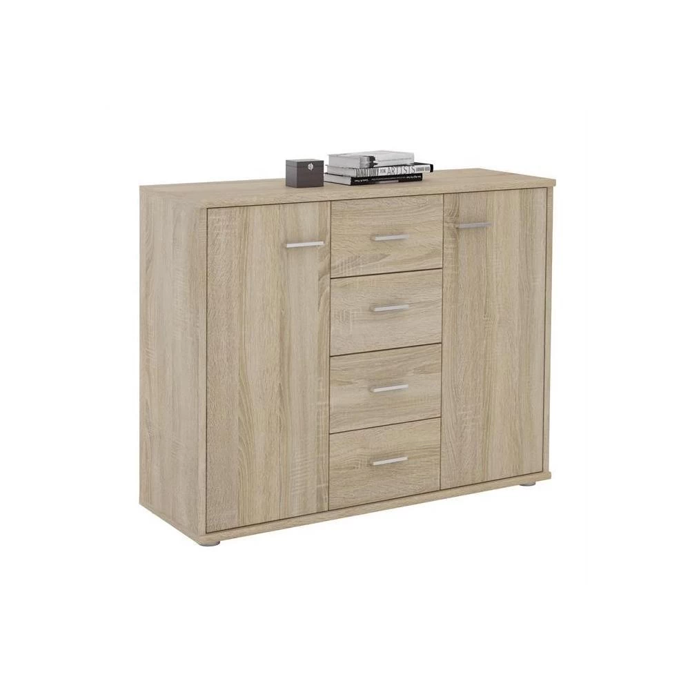 – Le buffet est fabriqué à partir de panneaux de particules de bois recouvert d’un mélaminé au décor chêne sonoma.