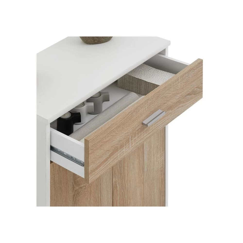 … est disponible dans différents coloris très modernes qui vous permettront de l’associer facilement avec le style de votre intérieur. Grâce à son tiroir et l’espace libre derrière les 2 portes avec une tablette de séparation vous pourrez ranger toutes vos affaires du quotidien et les mettre ainsi à l’abri. Enfin le mélaminé confère à ce meuble de rangement une meilleure résistance aux frottements et aux salissures et le rend très facile d’entretien.