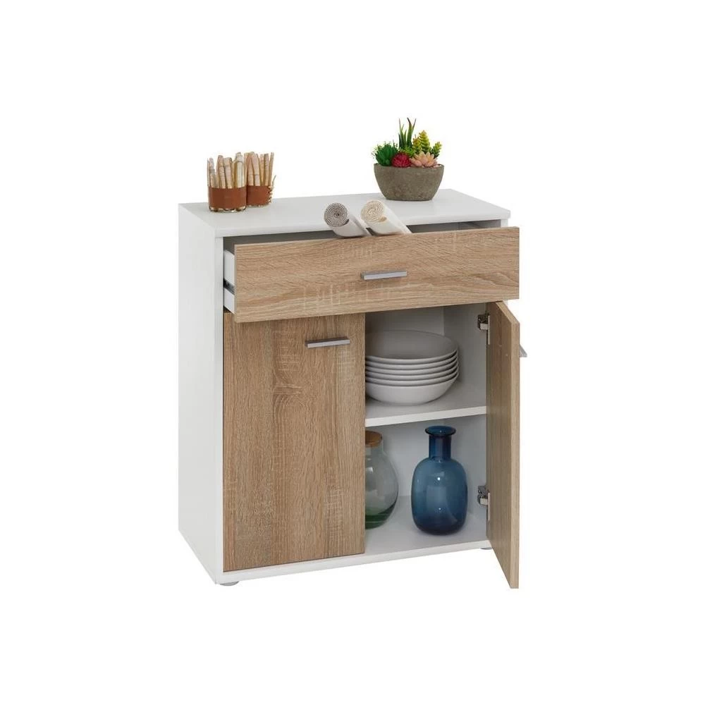 – Le buffet est fabriqué à partir de panneaux de particules de bois recouvert d’un mélaminé de coloris blanc mat et décor chêne sonoma.