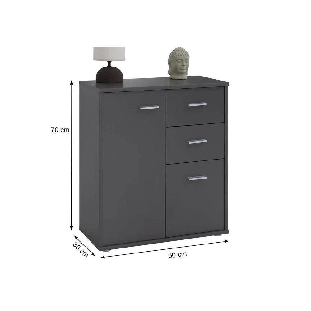 – Le buffet est fabriqué à partir de panneaux de particules de bois recouvert d’un mélaminé de coloris gris mat.