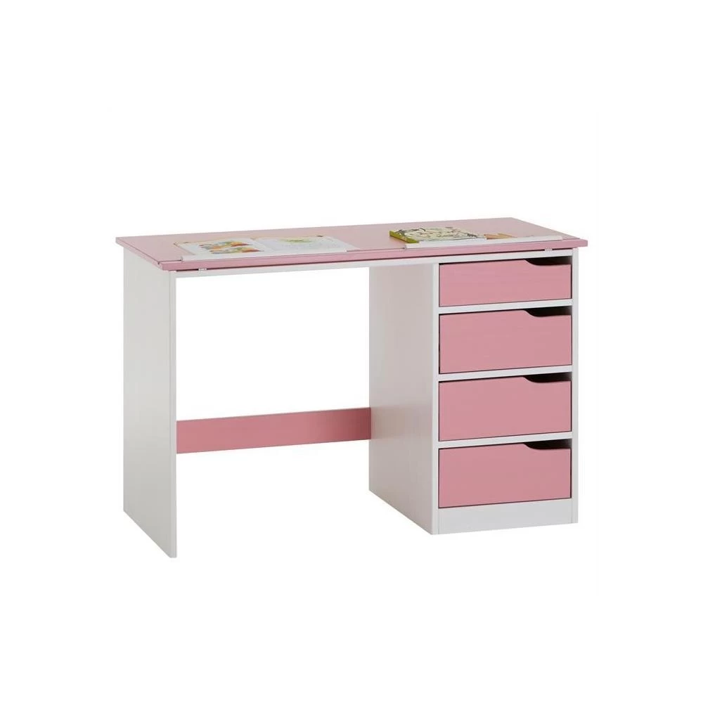 – Le bureau est fabriqué en pin massif lasuré blanc et rose