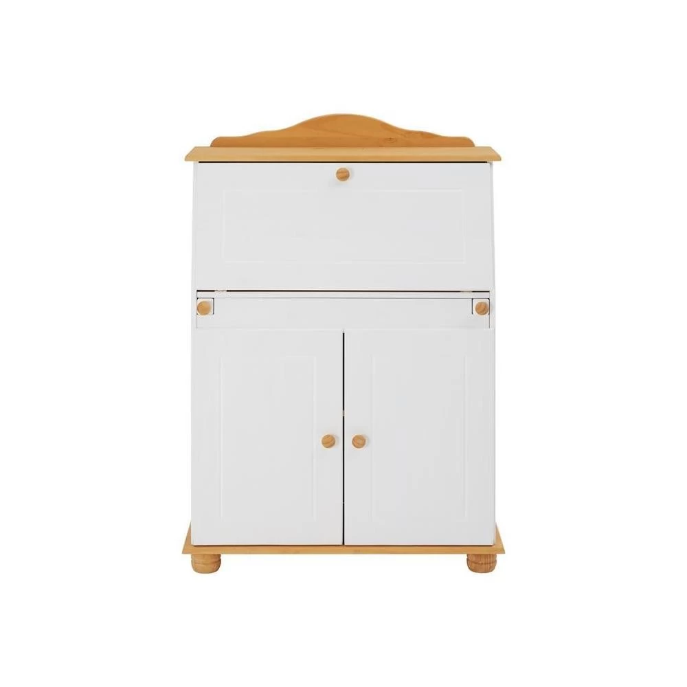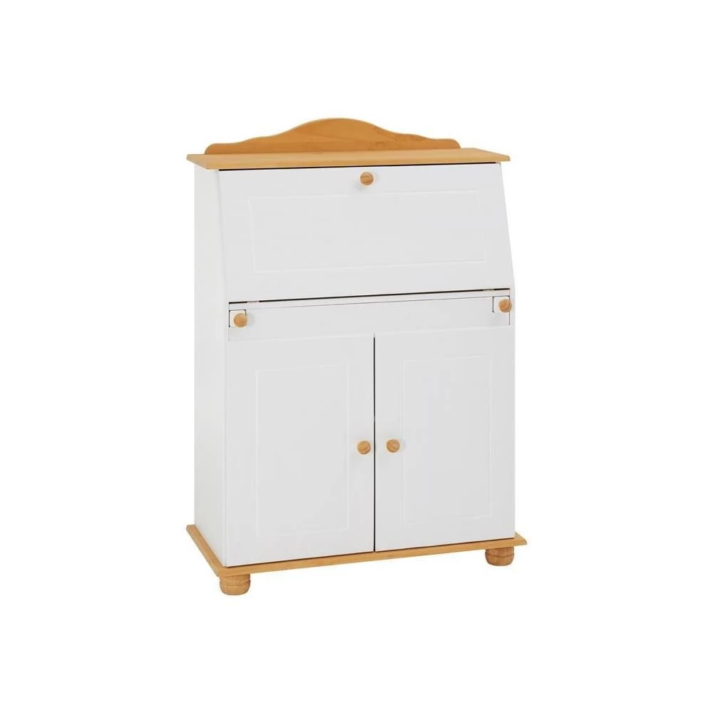 – Le secrétaire est fabriqué en pin massif recouvert d’une lasure blanche et brune.
