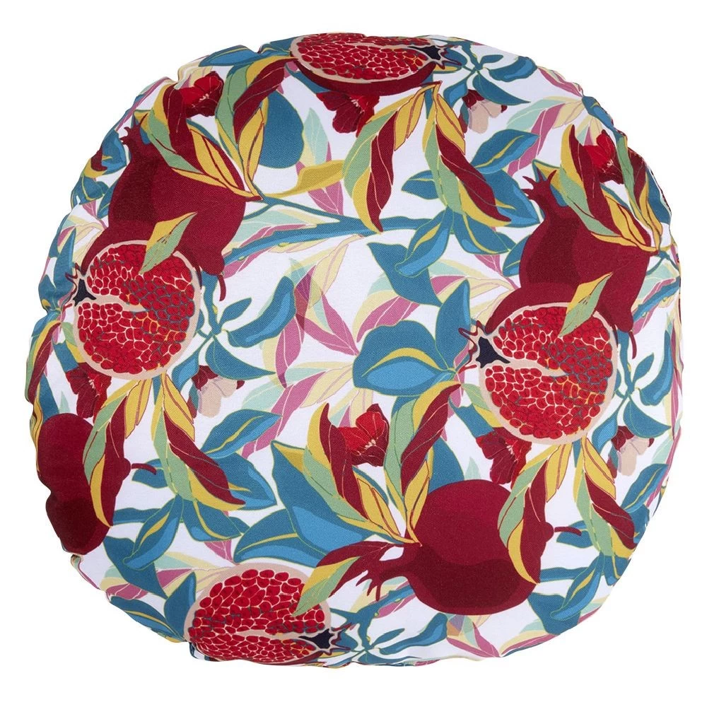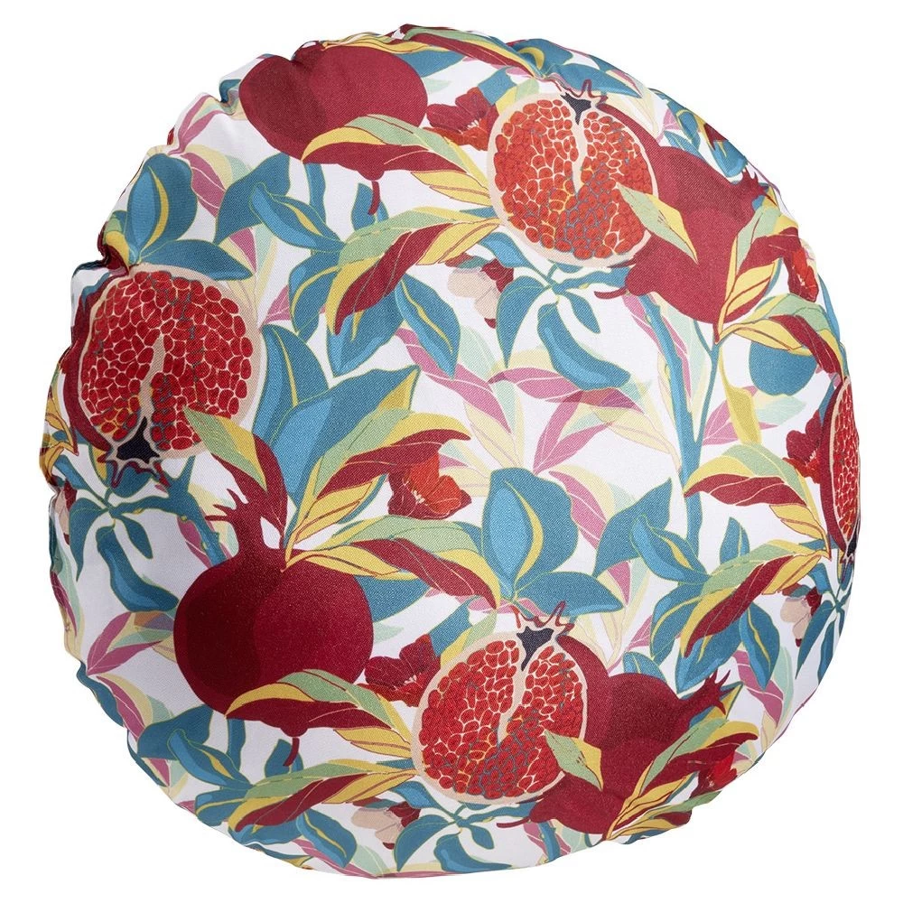 Apportez un brin d’exotisme à votre décoration d’extérieur avec ce coussin de forme ronde imprimé feuillages bleus et roses avec grenades rouges sur fond blanc. Déperlant, les gouttes glisseront sur le coussin, un simple coup d’éponge suffira.