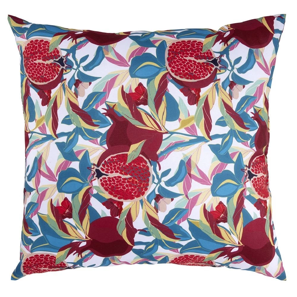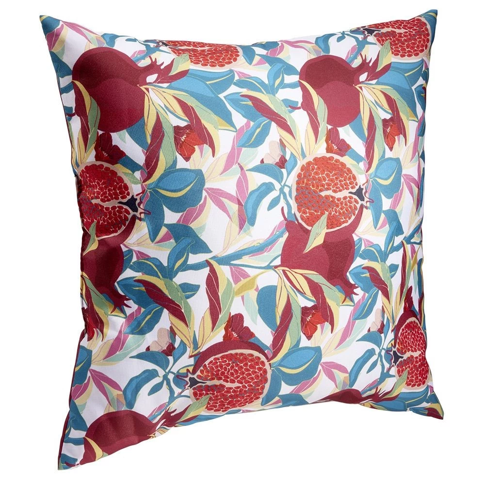 Apportez de l’exotisme à votre décoration d’extérieur avec ce coussin carré biface d’un côté uni rouge et de l’autre sur fond blanc imprimé feuillages bleus et roses avec grenades rouges. Déperlant, les gouttes glisseront sur le coussin, un simple coup d’éponge suffira.