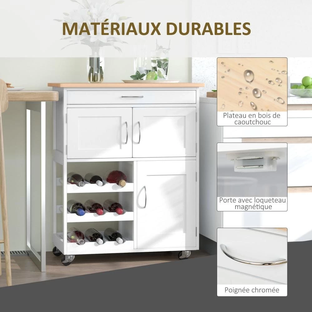 – Desserte multi rangements : grand tiroir coulissant, 2 placards (un double porte, un une porte), casier 9 bouteilles