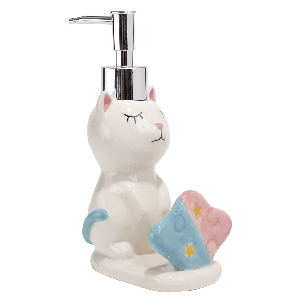 Apportez un brin de fantaisie à votre salle de bain ou vos sanitaires en disposant près du lavabo ce distributeur à savon en forme de chat avec porte-éponge rose et bleu.