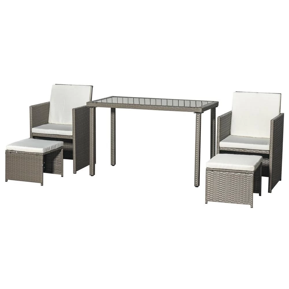 – Ensemble salon de jardin 4 personnes composé d’une table rectangulaire avec plateau en verre trempé, de 2 fauteuil et de 2 poufs grand confort