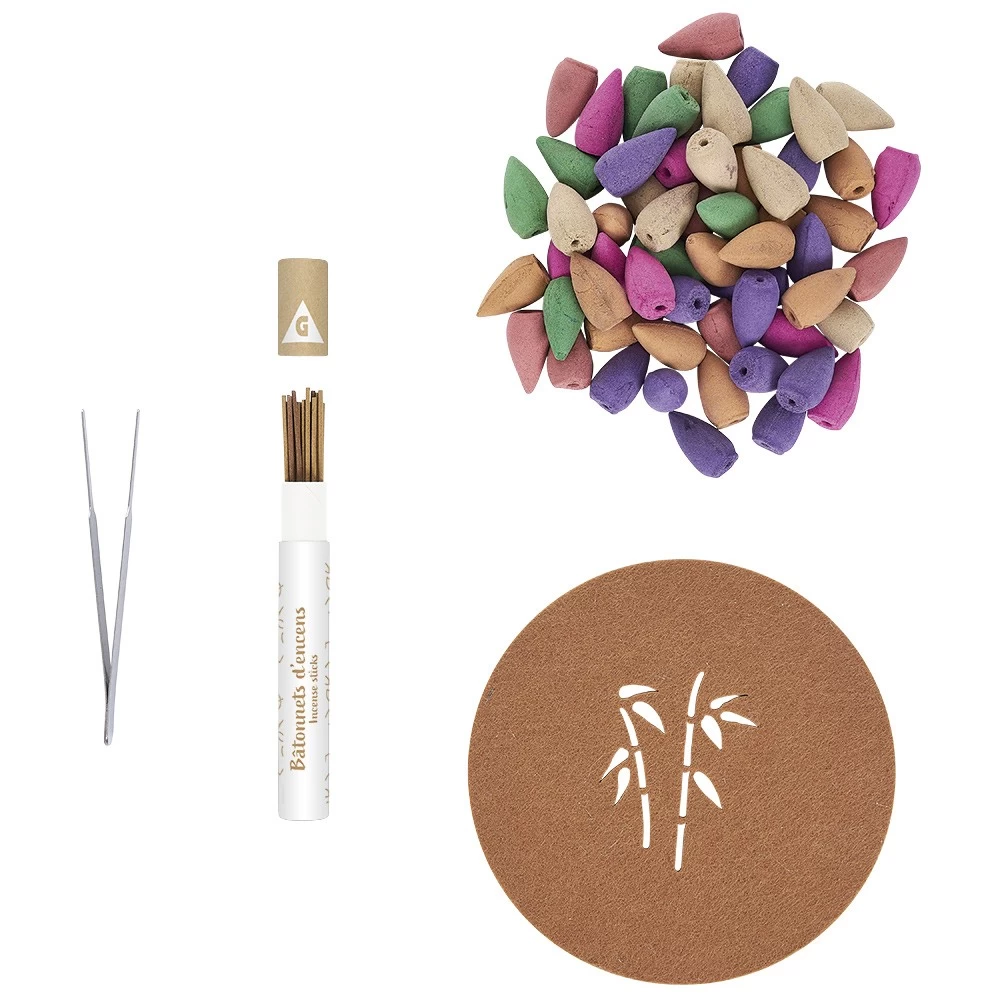 Inclus 60 cônes d’encens senteur lavande, rose, lis, bois de santal, osmanthe et thé vert et 30 bâtonnets.