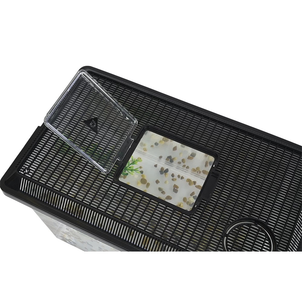 Sur le dessus, vous trouverez un emplacement vous permettant de poser votre boîte de nourriture pour poissons et autres, ainsi qu’une petite trappe pour les nourrir sans avoir à ôter le couvercle.
