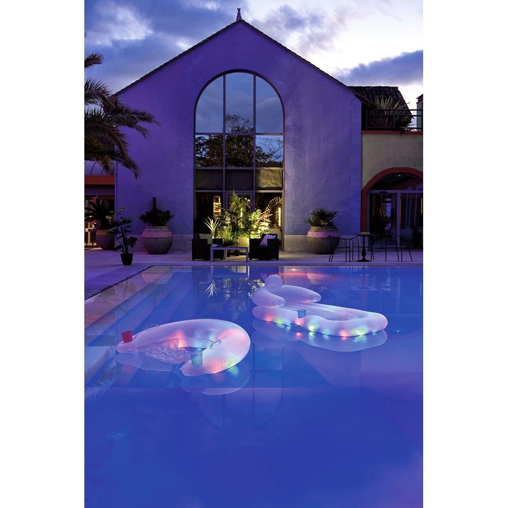 Matelas siège gonflable lumineux avec 3 fonctions d’éclairage pour encore plus de funs ! Parfait pour profiter de la piscine jusqu’au bout de la nuit !