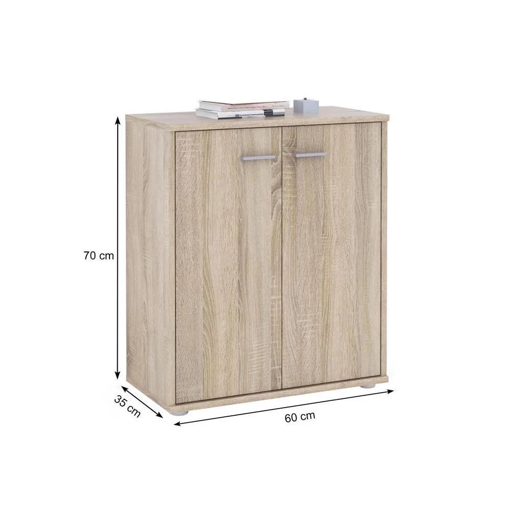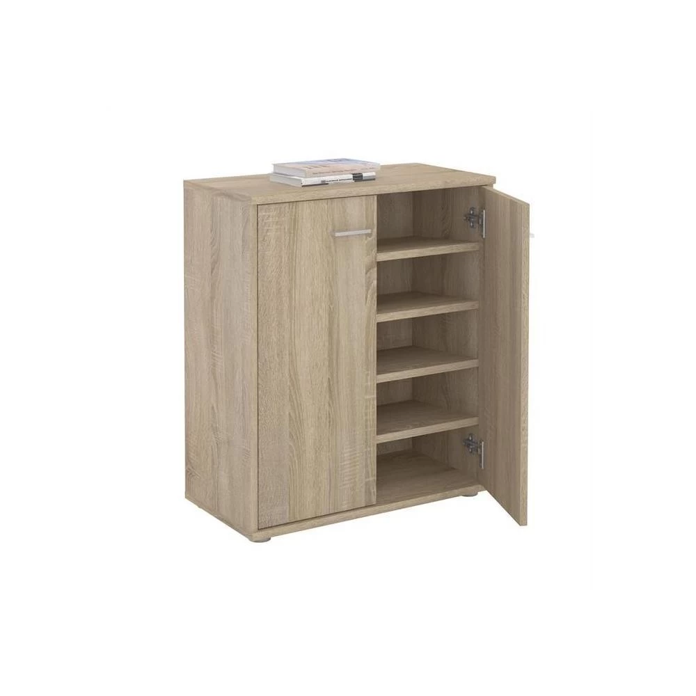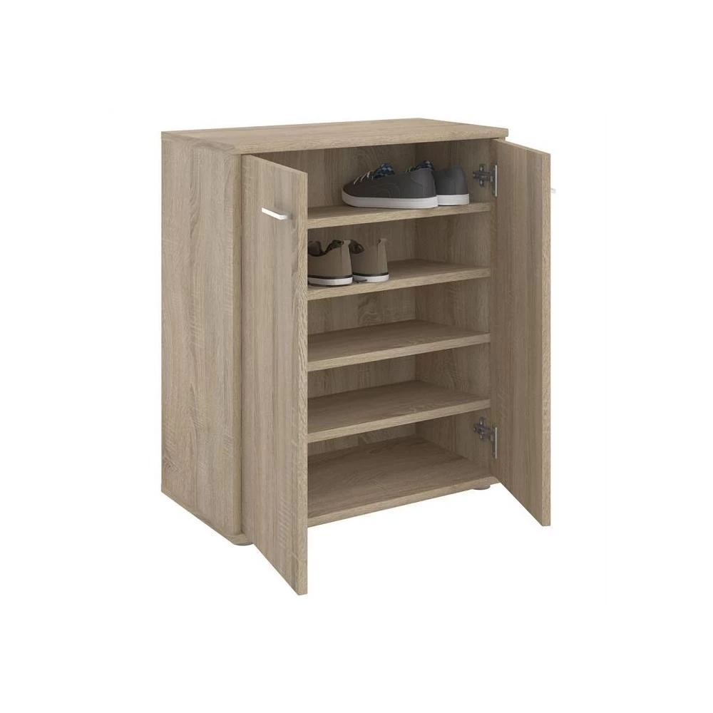 – Le meuble à chaussures est fabriqué à partir de panneaux de particules de bois recouvert d’un mélaminé au décor chêne sonoma.