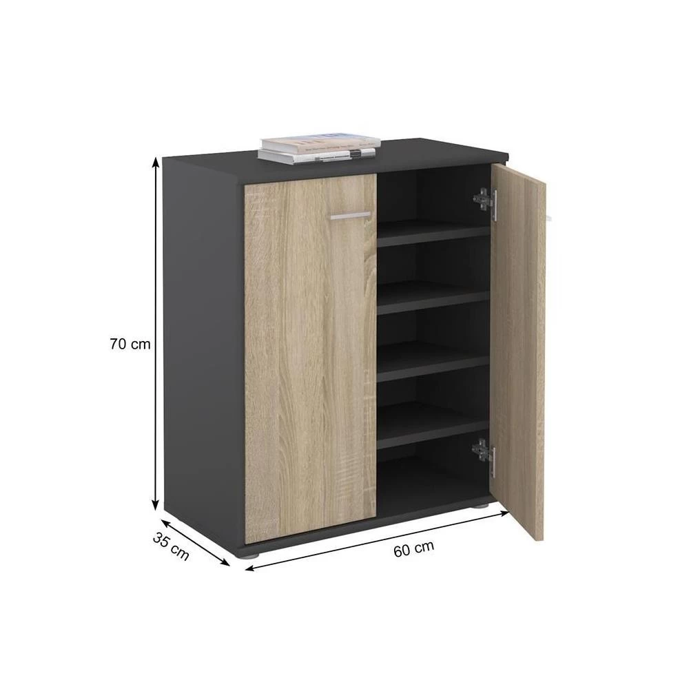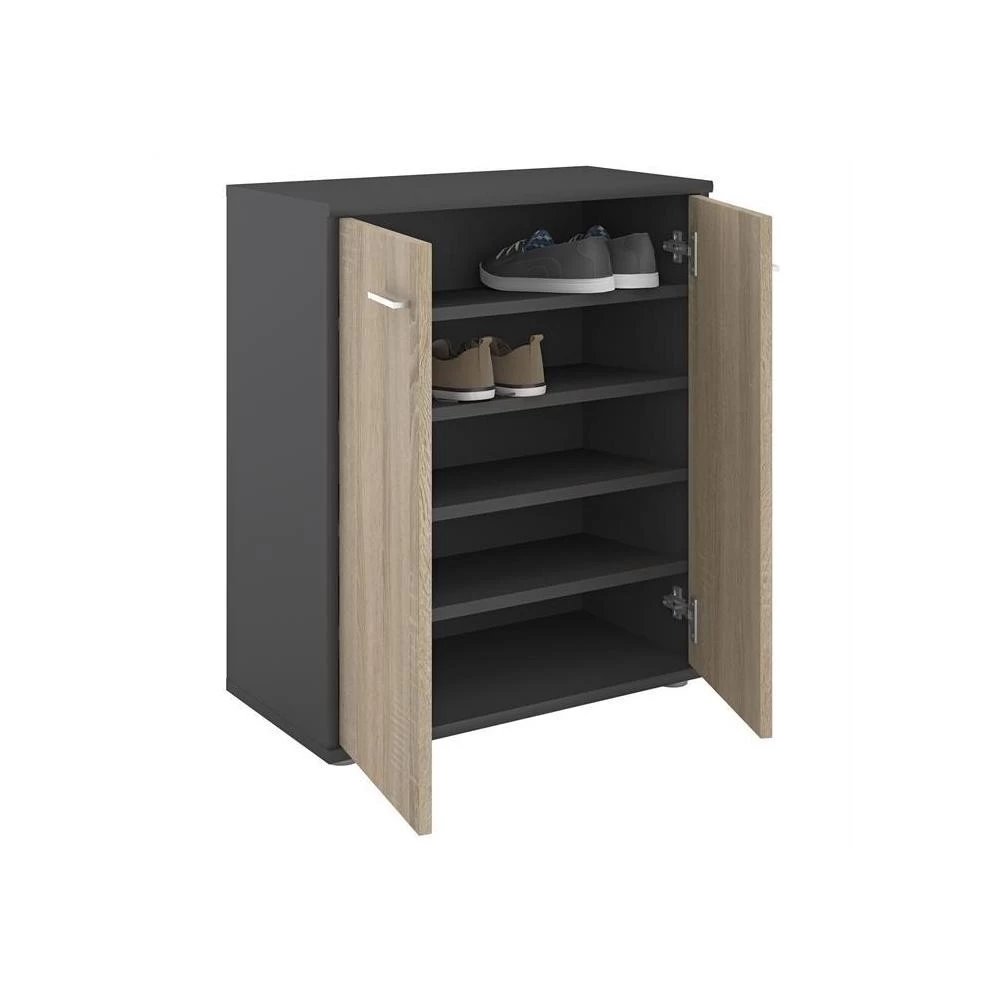 – Le meuble à chaussures est fabriqué à partir de panneaux de particules de bois recouvert d’un mélaminé de coloris gris mat et décor chêne sonoma.