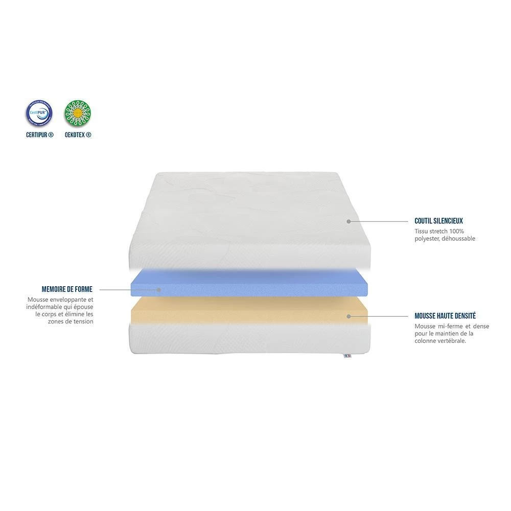 - 17,5 cm de mousse Haute Densité de 33 kg/m³ + 6,5 cm de mousse à mémoire de forme de 60 kg/m³