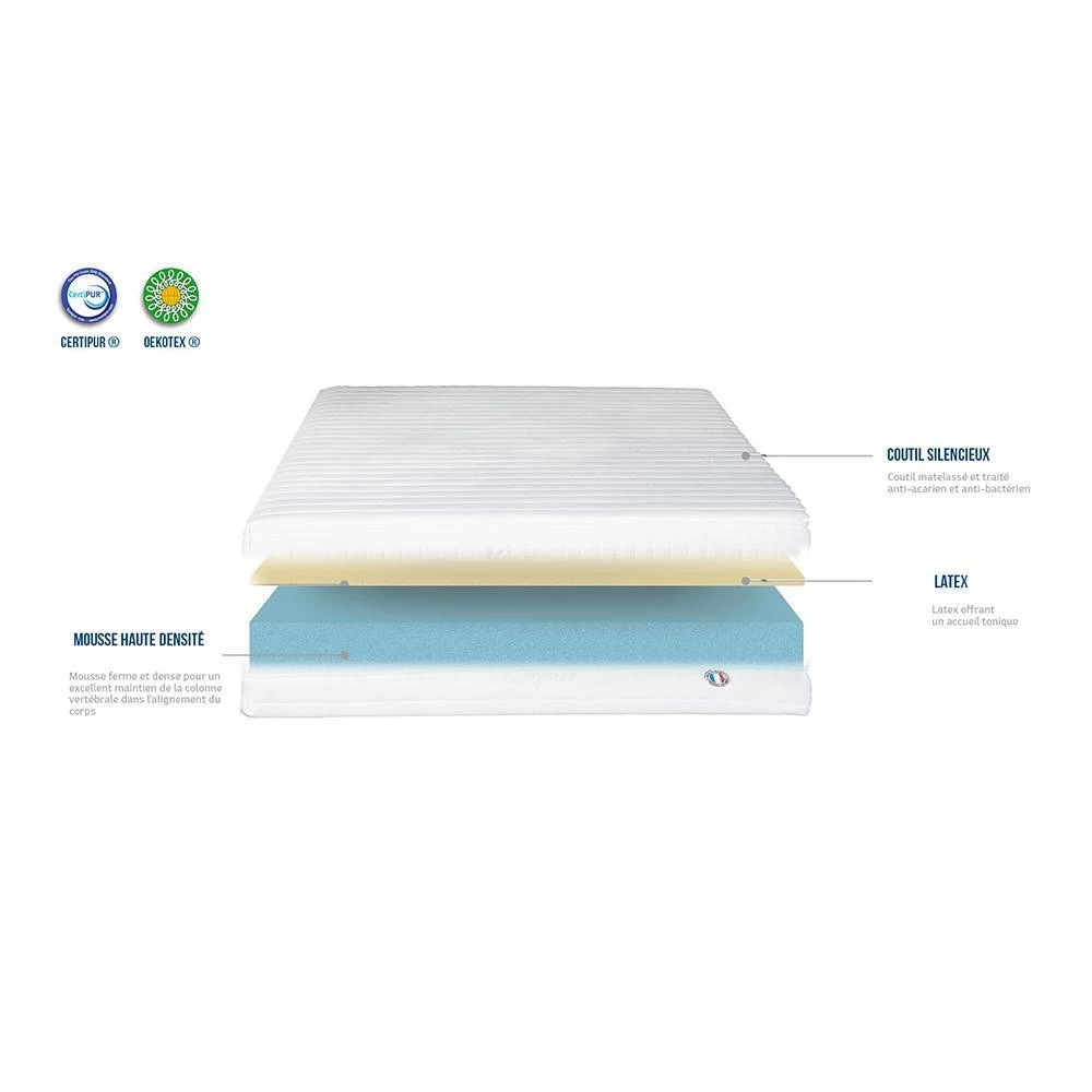 - 10 cm de mousse Haute Densité de 25 kg/m³ + 2 cm de latex Like de 65 kg/m³