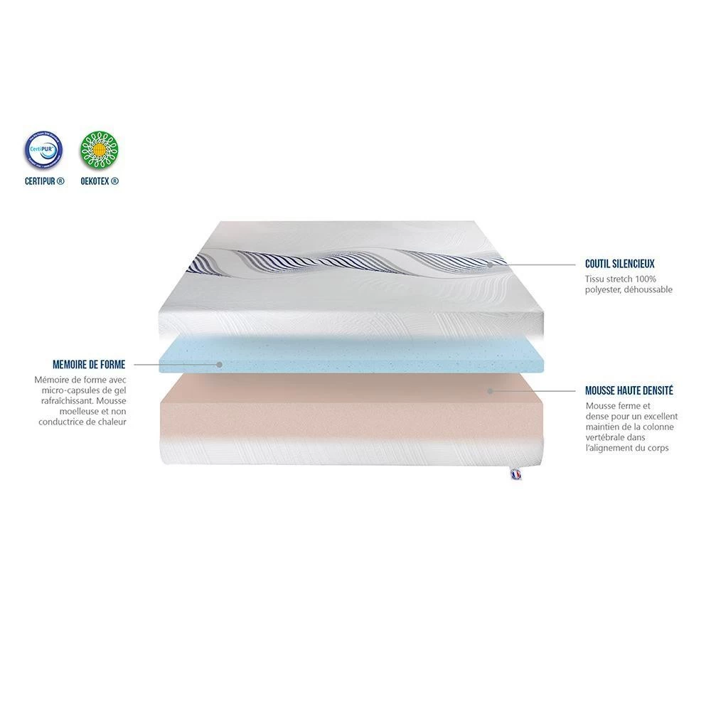 - 15 cm de mousse Haute Densité de 33 kg/m³ + 5 cm de mousse à mémoire de forme de 60 kg/m³ avec microcapsules de gel rafraîchissant