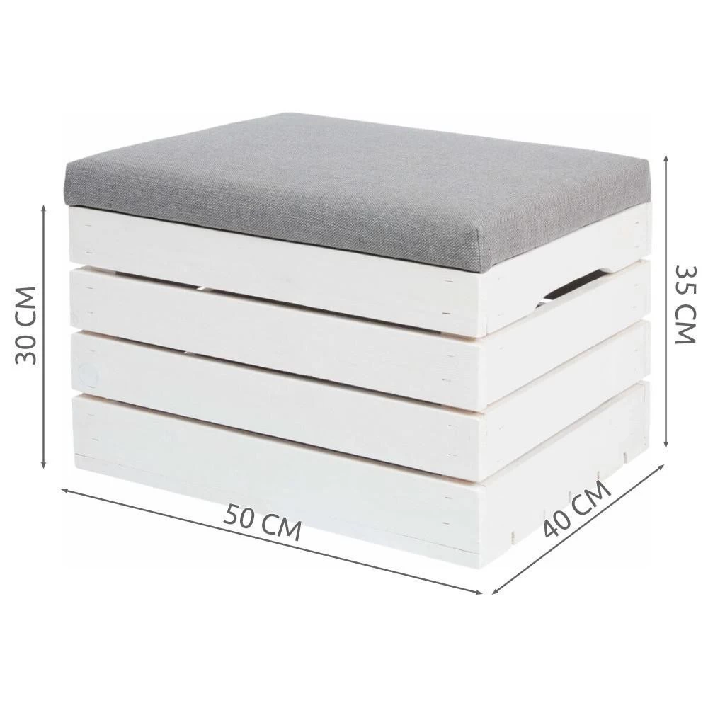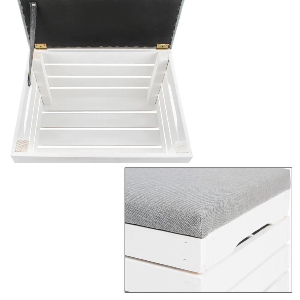 Le siège rembourré du coffre de rangement est confortable (mousse T-25 recouverte de tissu gris). Le coffre en bois séché et raboté (épicéa) est résistant. Il est peint avec une peinture acrylique et verni. Il pourra être placé sur un balcon. Le coffre de rangement repose sur des patins (feutres) pour éviter de rayer le sol lors de son déplacement.