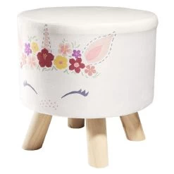 Apportez une touche déco à la chambre de votre enfant tout en y apportant un confort supplémentaire avec ce pouf blanc motifs licorne et fleurs sur 4 pieds en bois.