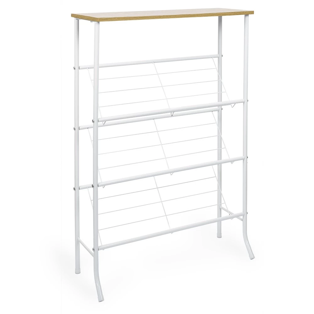 Optimisez votre espace avec ce range-chaussures en métal blanc vous permettant d’entreposer jusqu’à 9 paires. Une tablette en bois se trouve sur le dessus afin de pouvoir y disposer des accessoires ou bien des objets déco.