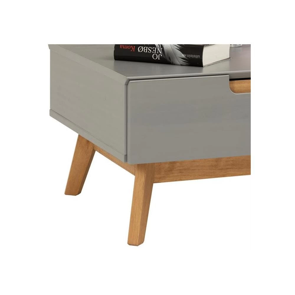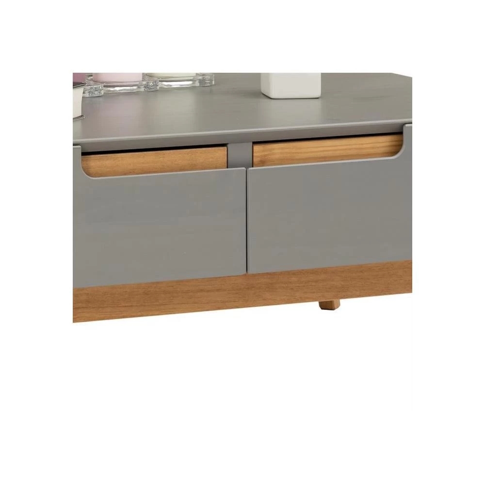 – La table basse est fabriquée en pin massif recouverte d’une lasure grise.
