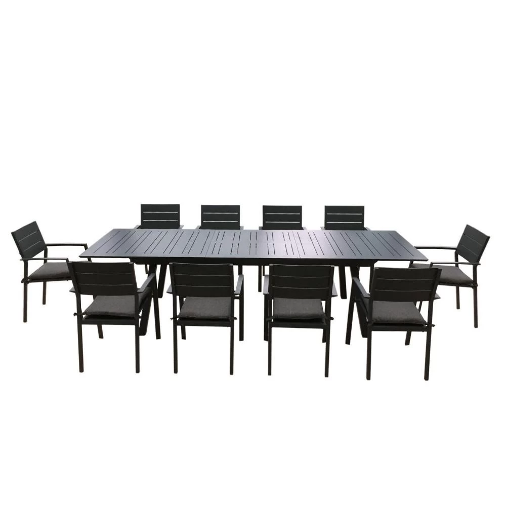 Cet ensemble s’intègrera facilement et s’adapte à vos envies. Il est composé de 10 fauteuils empilables (coussins fournis) en textilène ainsi que d’une table haute extensible qui passe de 216 à 300 cm grâce à son plateau en aluminium.