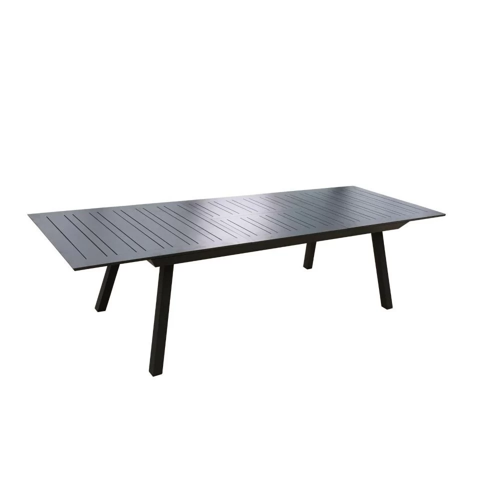 La structure de table et des fauteuils est en aluminium recouvert d’une peinture époxy anthracite.