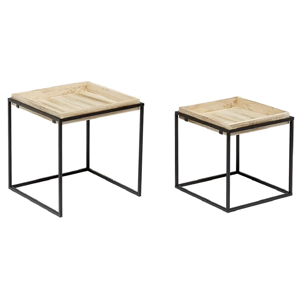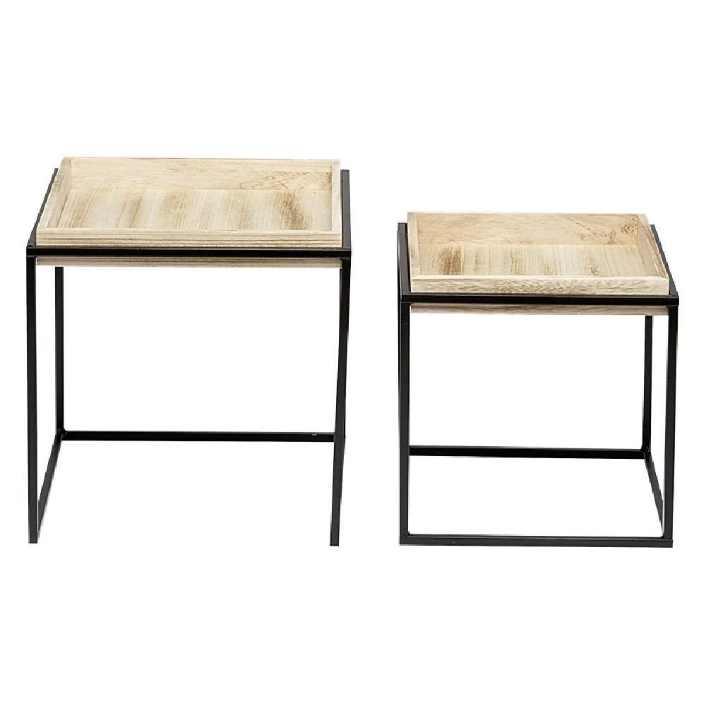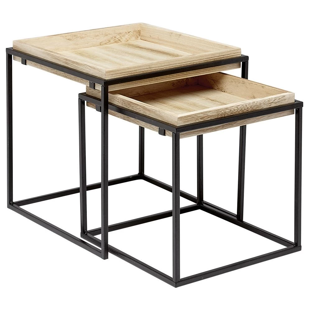 Ensemble de 2 tables gigognes carrées avec structure en métal noir et plateau en MDF (panneau de fibres de bois) naturel à utiliser ensemble ou séparément en tables d’appoint.