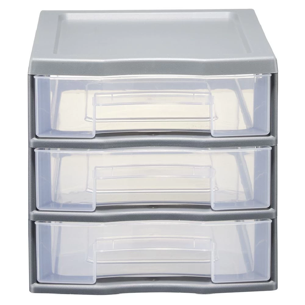 Tour de rangement en plastique gris composée de 3 tiroirs au format A6. Idéale pour organiser vos affaires dans le bureau ou l’atelier.